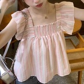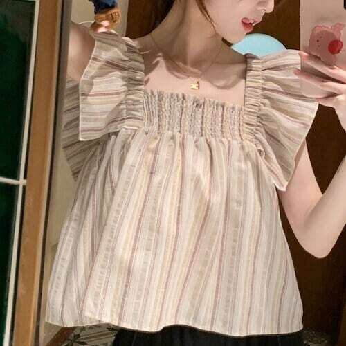 フリルトップス ストライプ フレアブラウス フェミニン E362