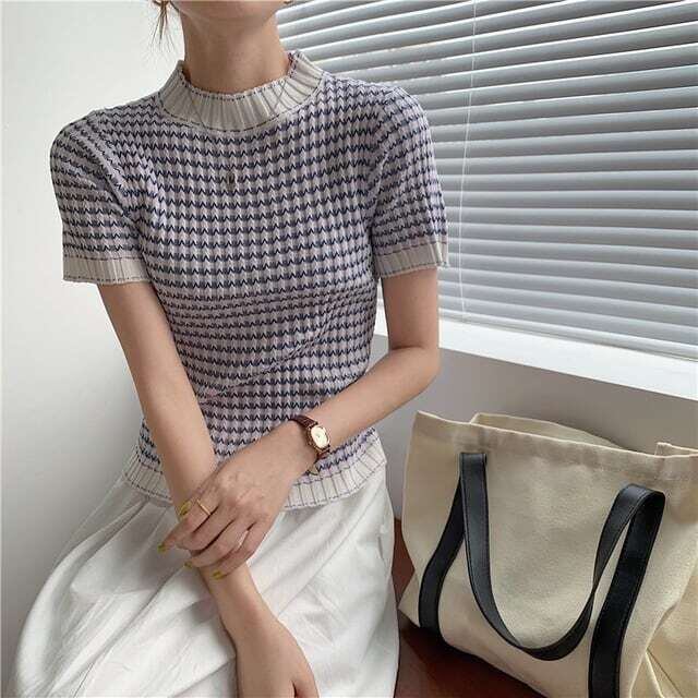 ボーダーサマーニット 半袖 カジュアル ガーリー E337