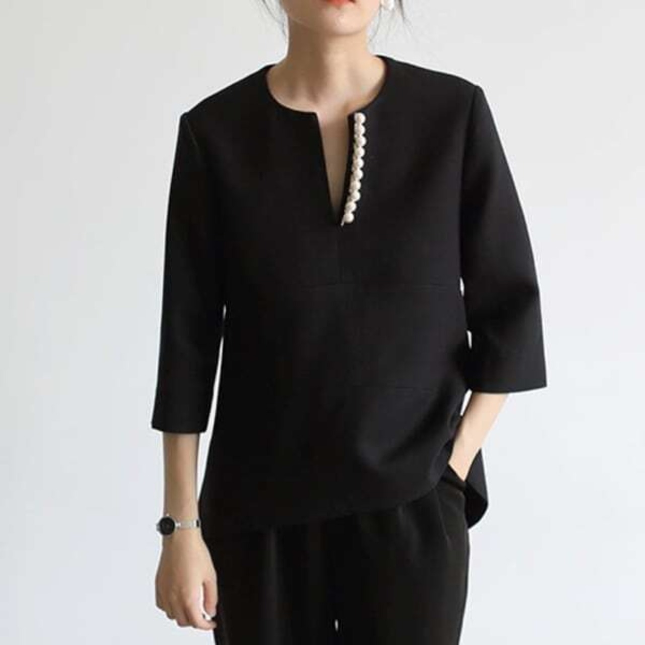 パールモチーフトップス Vネックトップス エレガント オフィスカジュアル お呼ばれ E176