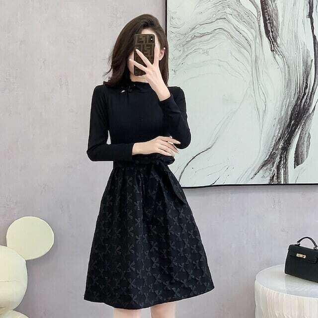 リボン柄ワンピース ウエストリボン レトロ ガーリー お呼ばれ E545