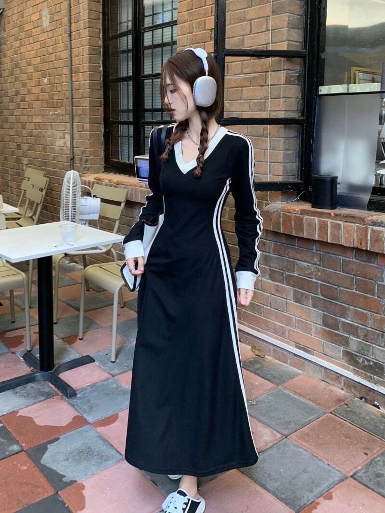 サイドラインワンピース Vネック スポーティー カジュアル E543